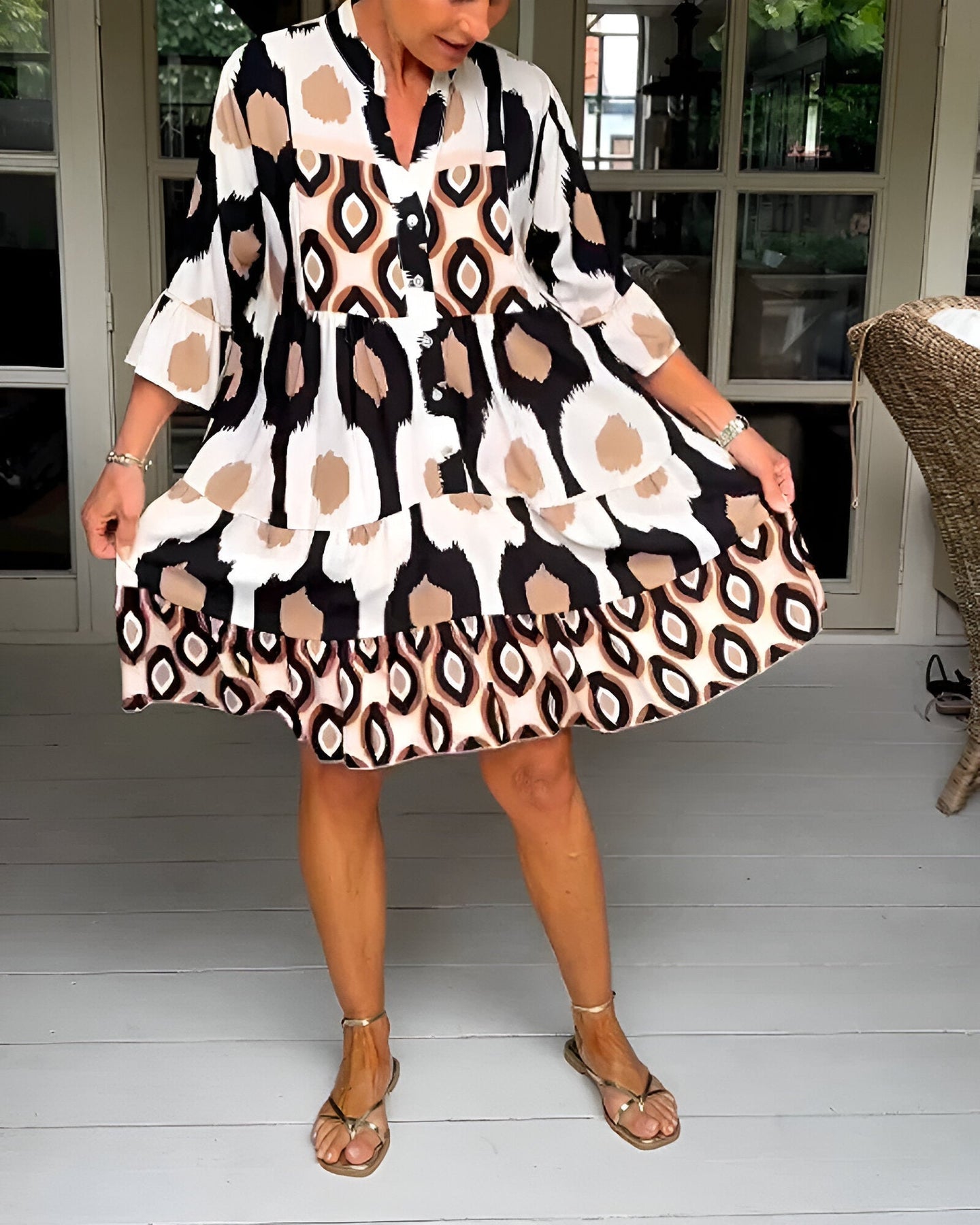 The lightweight, breathable fabric and tiered skirt offer a graceful drape and freedom of movement, while the V-neckline with button accents adds just the right amount of polish.