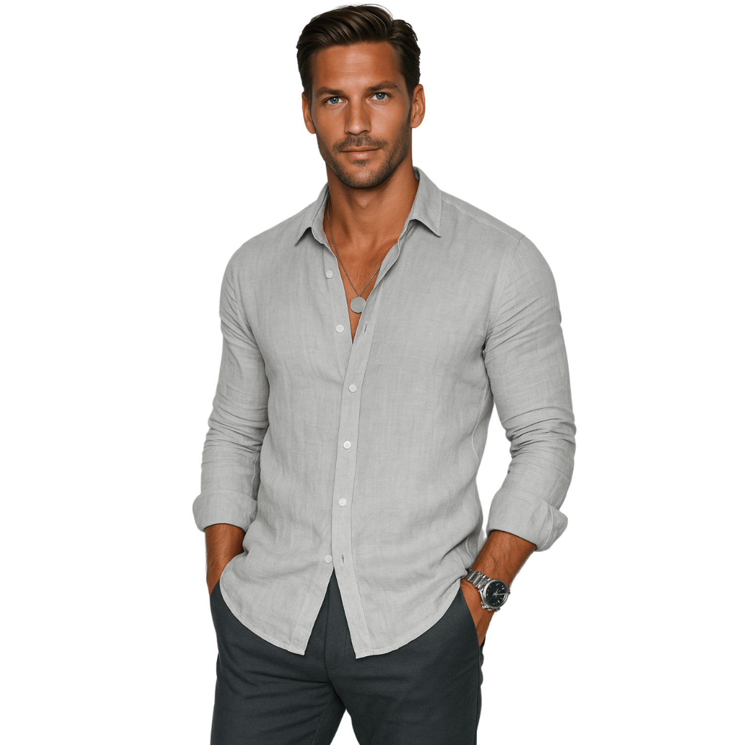 Met opgerolde mouwen en een open kraag straal je moeiteloos zelfvertrouwen uit zonder te overdrijven.